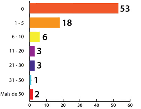 Seis instituições não contam com voluntários atuando diretamente com a população refugiada ou migrante. A maioria, no entanto (29 instituições, ou 33%), conta com 1 a 5 pessoas voluntárias, e 21 organizações (24%) contam com 6 a 10 voluntários. As demais 30 instituições contam com mais de 10 voluntários trabalhando junto à esta população, sendo que 3 contam com mais de 50 pessoas voluntárias.