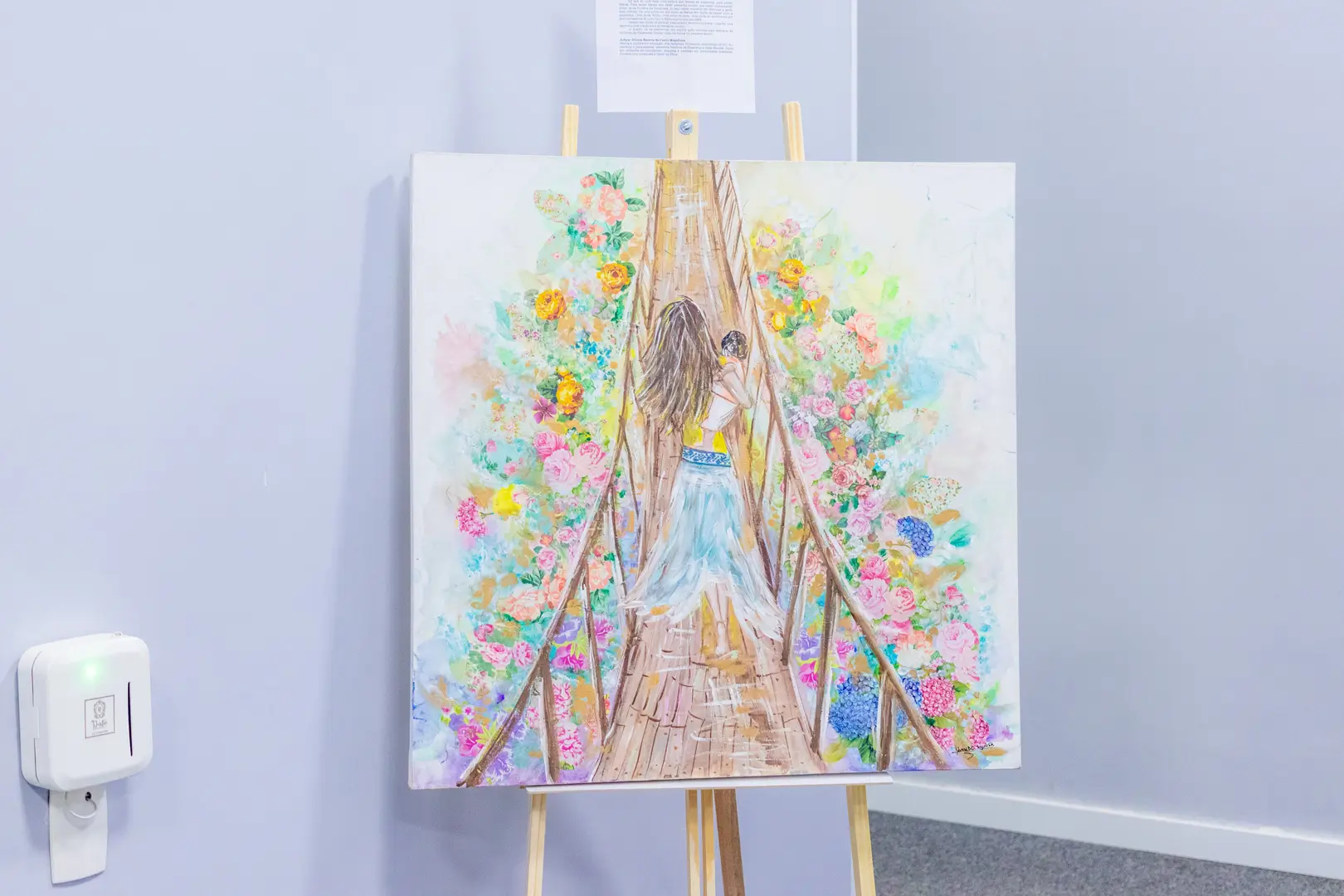 Essa tela retrata a história da Maria, uma jovem mãe que saiu da Venezuela em busca de esperança. Por causa de muito sofrimento, de muita dificuldade, ela resolveu partir. Maria pegou seu filhinho, bebê, e com toda a dor de sair de onde tinha suas raízes, foi em busca de uma vida melhor. Maria, seu bebê, junto com as outras mulheres andaram muito, no frio, na noite, no calor do dia, com a alimentação que era possível, até que seu bebê começou a adoecer nos seus braços. Ela não podia voltar. Ela precisava continuar. Depois de alguns dias, quando Maria estava quase chegando no seu destino, o bebê ficou muito doente.